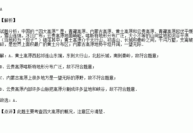 A.高原西起祁连山东端,东到太行山,北起长城,南到秦岭