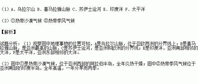 (2)①②两处纬度相同,但气候类型不同,① 气候,② 气候。