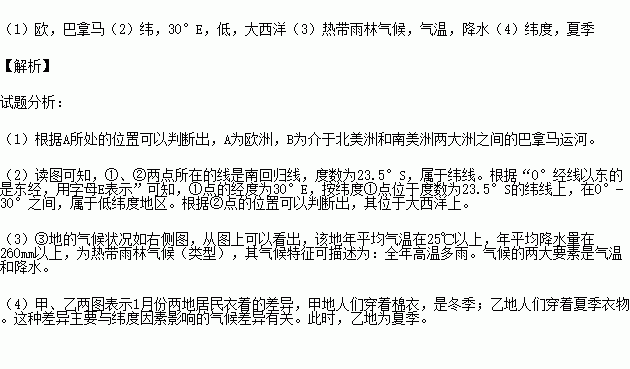 (4)甲、乙两图表示1月份两地居民衣着的差异,这种差异主要与_______(海陆、纬度、地形)因素影响的气候差异有关。此时,乙地为_______季(季节)。