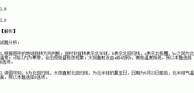 读图,圆圈a、b、c分别代表赤道、回归线、极圈,图中箭头表示地球自转的方向。据此回答下列问题。
