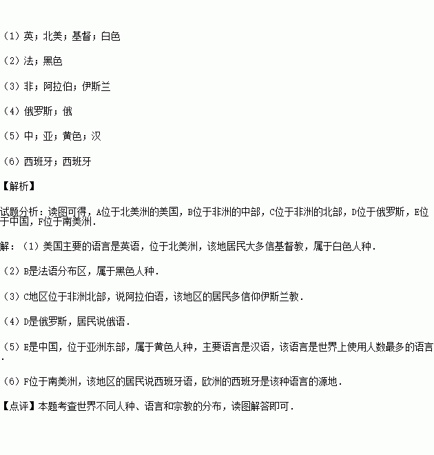 (1)A是_________语分布区,位于_________,该地居民大多信_________教,属于_________人种.