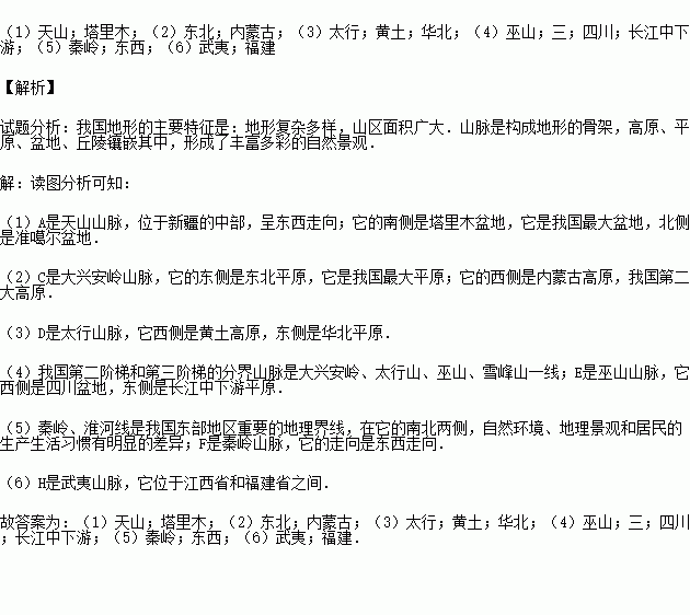 (4)E是 山脉,它在我国地势第二级阶梯和第 级阶梯的分界线上.它西侧是 盆地.东侧是 平原.