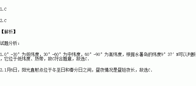 2016年1月6日我国海航、南航两架飞机降落在9°37′N,112°58′E的永暑岛机场,据此回答下列各题。
