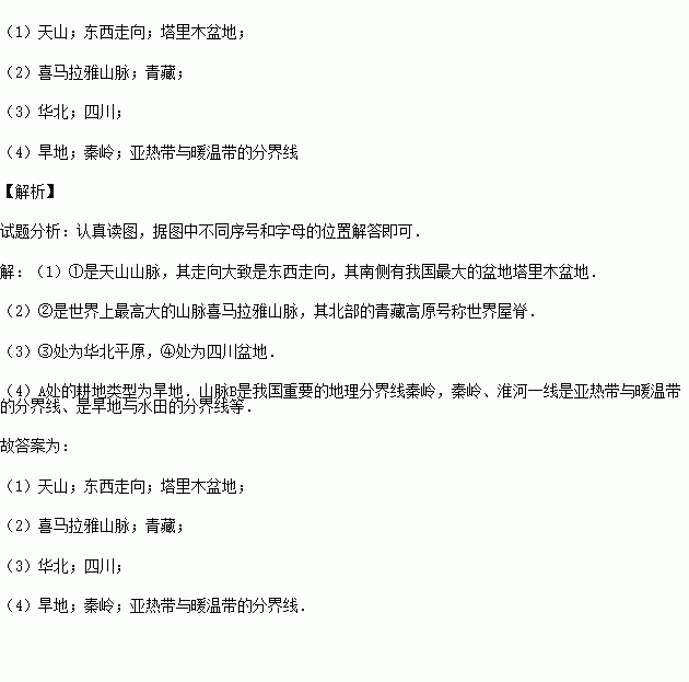 (1)①是 山脉,其走向大致是 ,其南侧有我国最大的盆地 .