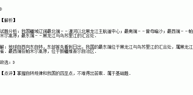 电视剧《西游记》的主题曲《敢问路在何方》中唱道:“你挑着担,我牵着马,迎来日出,送走晚霞”;那么我国最早“迎来日出”的地区与最迟“送走晚霞”的地区所在的省(市、自治区)是( )