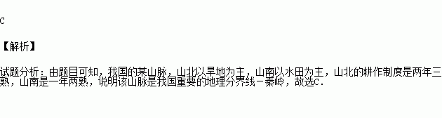 我国的某山脉,山北以旱地为主,山南以水田为主,山北的耕作制度是两年三熟,山南是一年两熟,这条山脉是: ( )