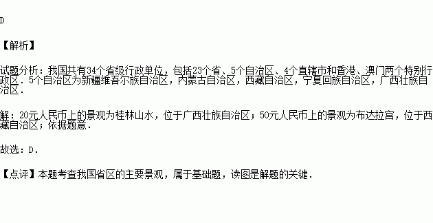 图中,人民币上的景观所在的自治区分别是( )