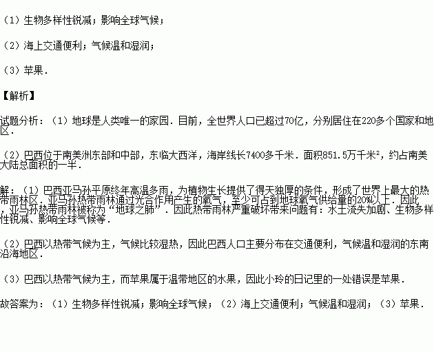 (3)小玲在旅行日记中有下面一段话:“不论在巴西街头,还是海滩,到处可以看到各种肤色的青年在踢足球,商店货架上摆满了当地出产的咖啡、甘蔗、苹果等农产品.”小玲的日记里有一处错误,请你指出来. .