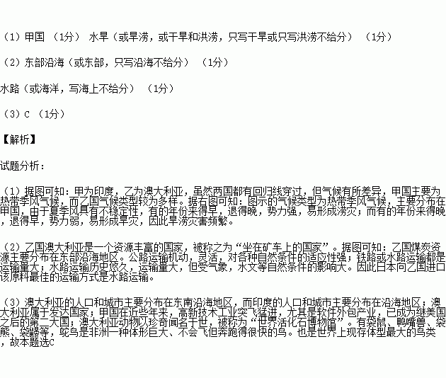 (2)乙国煤炭资源主要分布在 地区,日本向乙国进口该原料最佳的运输方式是 运输。