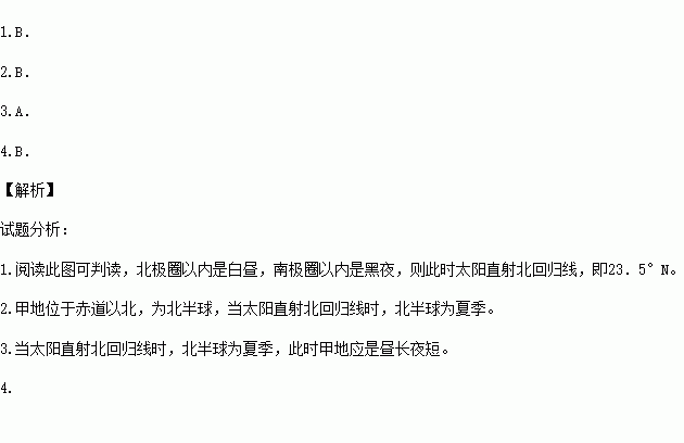 3.B地昼夜长短状况是 ,B点比A.点单位面积上得到的太阳光热 ,气温 。