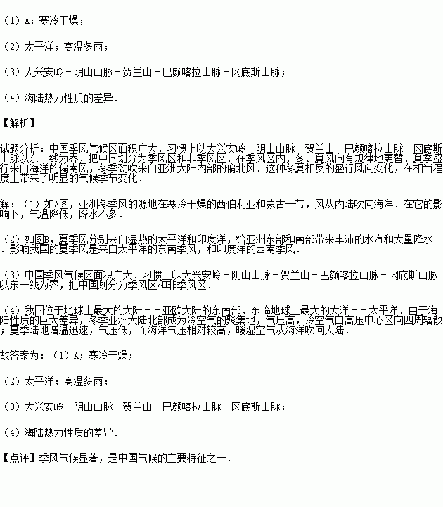 (4)简述我国季风形成的主要原因: .