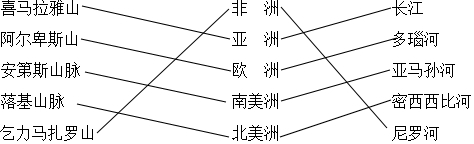 解答 解:喜马拉雅山是世界最高大的山脉,位于亚洲,长江是亚洲第一长河;阿尔卑斯山位于欧洲,多瑙河位于欧洲,是世界上流经国家最多的河流;安第斯山是世界上最长的山脉,位于南美洲,亚马孙河是世界上流域面积最广的大河,位于南美洲;洛基山脉位于北美洲,密西西比河是北美洲最大的河流;乞力马扎罗山是非洲最高峰,尼罗河是世界最长的河流,位于非洲.