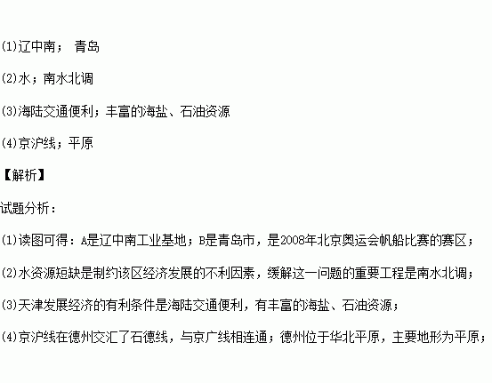 (1)A是______工业基地,B是_______市,是2008年北京奥运会帆船比赛的赛区。