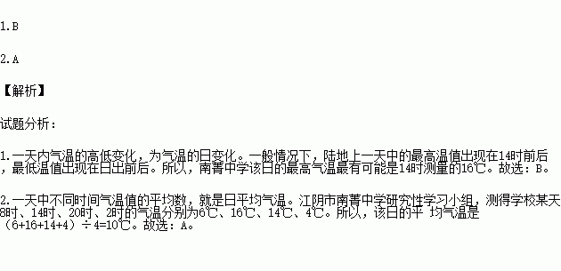 江阴市南菁中学研究性学习小组,测得学校某天8时、14时、20时、2时的气温分别为6℃、16℃、14℃、4℃。据此完成下列问题