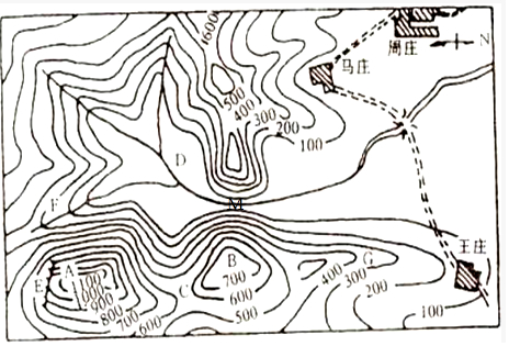 (2)图中字母C处位于两山顶之间相对低洼的部位,为鞍部;E处是几条海拔高度不同的等高线重合的部位,是陡崖.F处等高线向海拔高处凸,为山谷.