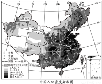 下图是“中国人口密度分布图”,读图完成下列问题。