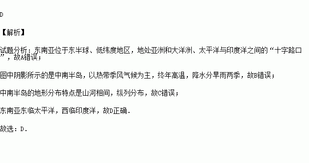 B.阴影部分区域以热带雨林气候为主,常年高温多雨