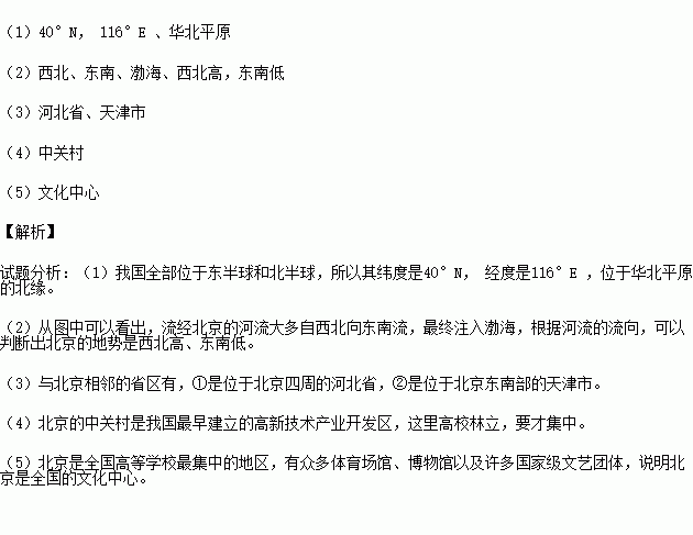 (1)从图中可以看出北京大致在 (经纬度)附近;位于 (地形区)的北缘。
