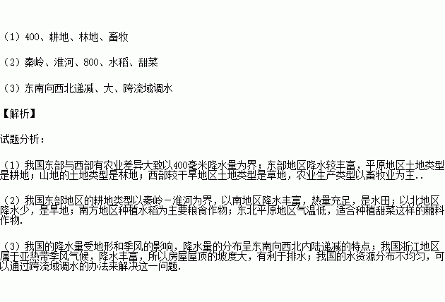 (1)我国东部地区和西部地区的农业差异大致以 mm等降水量线为界,东部地区平原的土地利用类型是 ___ 地,东北大、小兴安岭和长白山地的土地利用类型是_____ 地;西部地区天然草场广布,以 业为主。