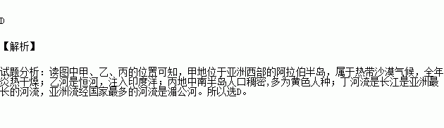 C.丙地人口稠密,多为黄色人种 D.丁河流是亚洲流经国家最多的河流