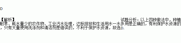 A. 种植耐旱、耗水量少的农作物 B. 工业污水处理,达标排放 C. 生活用水一水多用 D. 大量使用洗涤剂和清洁剂