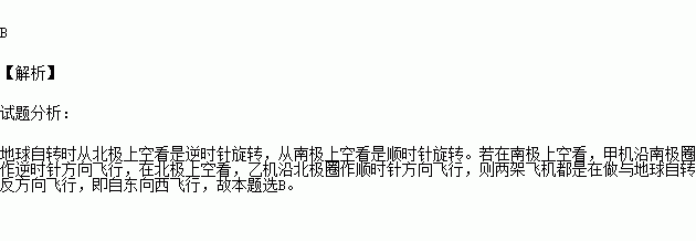 在南极上空看,甲机沿南极圈作逆时针方向飞行,在北极上空看,乙机沿北极圈作顺时针方向飞行,这两架飞机的飞行方向( )