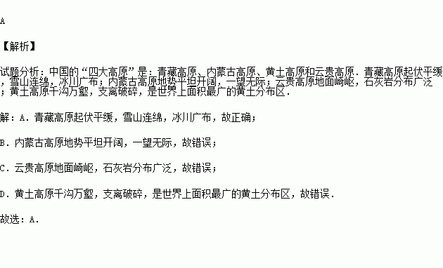 A.青藏高原﹣雪峰连绵 B.内蒙古高原﹣地面崎岖
