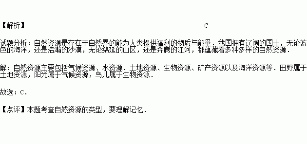 “和煦的阳光,广阔的田野,欢快的鸟儿”所描述的自然资源分别属于( )
