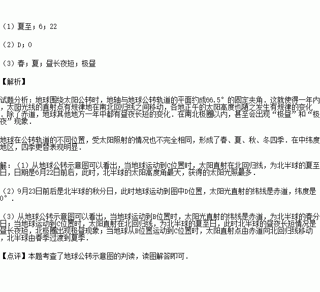 (3)当地球从B位置运动到C位置时,北半球由 季过渡到 季.在C位置时,北半球的昼夜长短情况是 ,并且北极圈出现 (填极昼或极夜)现象.