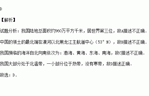 D.我国大部分地区位于北温带,气候复杂多样