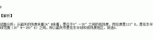 关于我们韶关经纬度位置(24°N,113°E)的叙述,正确的是:
