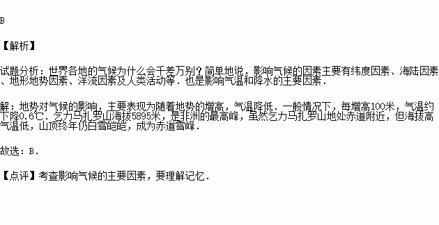 非洲的乞力马扎罗山虽地处赤道附近,但终年冰封峭立,白雪皑皑.影响乞力马扎罗山气候的主要因素是( )