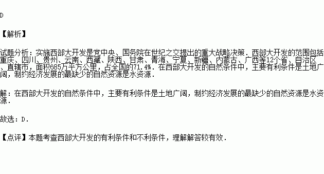 在西部大开发的自然条件中,主要有利条件和制约经济发展的最缺少的自然资源组合正确的是( )