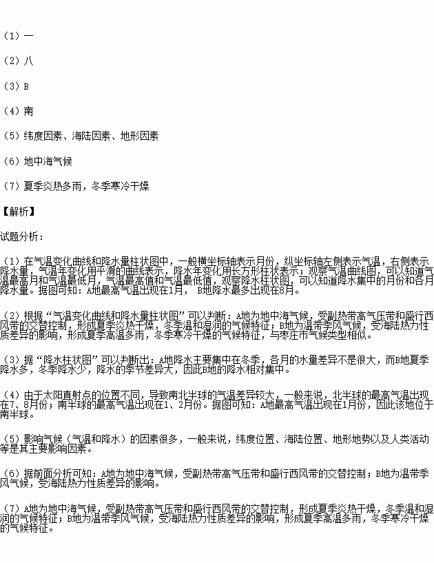 (1)A地最高气温出现在________月, B地降水最多出现在________月。