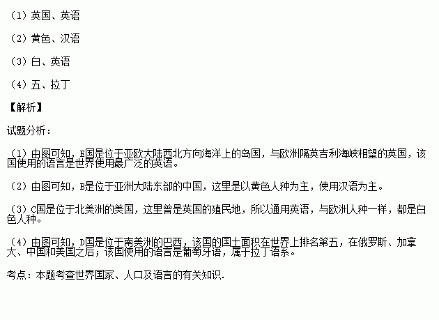 (1)写出E国的国名 ,该国使用的语言是 ;