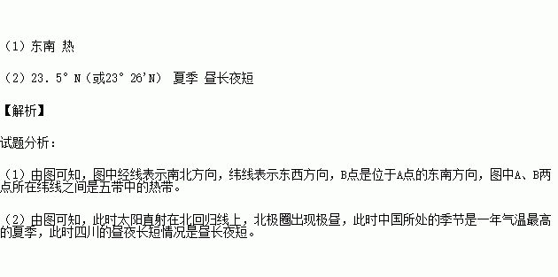 (1)图中B点位于A点的 方向,图中A、B两点所在纬线之间是五带中的 带。