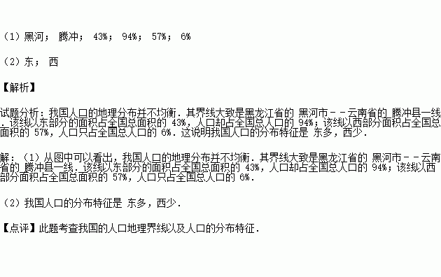 (1)从图中可以看出,我国人口的地理分布并不均衡.其界线大致是黑龙江省的 ____ 市﹣﹣云南省的 县一线.该线以东部分的面积占全国总面积的 %,人口却占全国总人口的 %;该线以西部分面积占全国总面积的 %,人口只占全国总人口的 %.