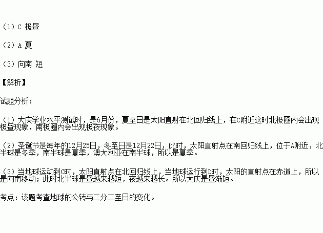 (3)当地球运动到C和D之间时,太阳直射点在地球表面的运动方向是_________,此时大庆市的白昼将变_____(填“长”或“短”)。