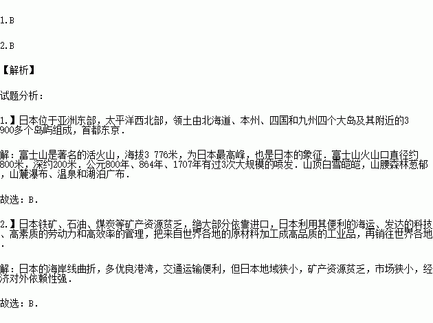 1.考察团到日本首都东京时正值樱花盛开的季节,旅游团成员提出了希望游览“日本国的象征”的旅游胜地,这个旅游胜地是( )