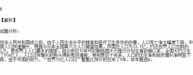 1970年至2010年间,由于中国的努力,“世界70亿人口日”整整比预计的迟来了5年。推迟的原因是( )