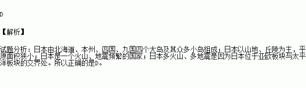 A、日本由北海道、本州、四国、九龙四个大岛及其众多小岛组成