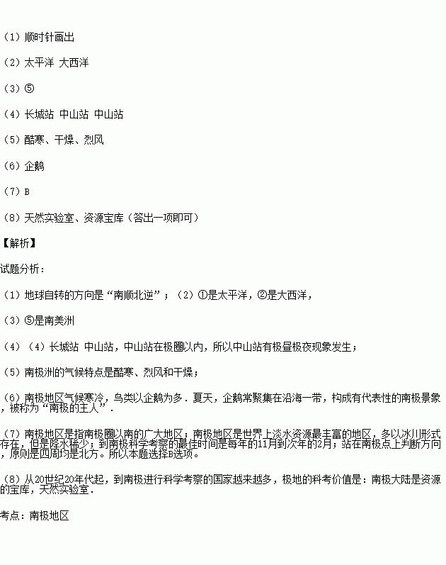 (1)请在南极地区图中画出地球的自转方向。
