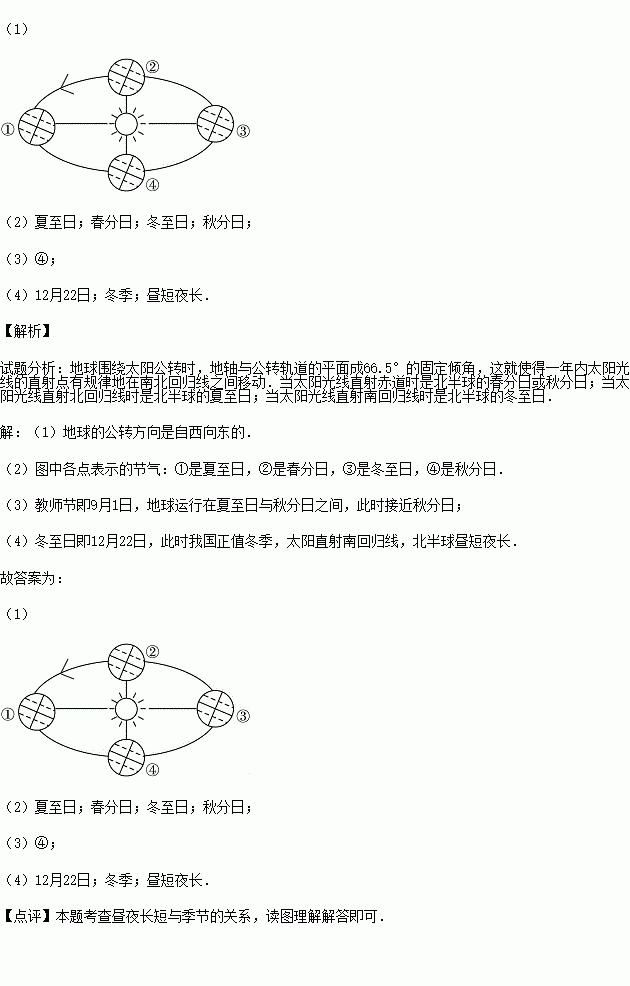 (3)教师节时地球位于公转轨道上的 点附近.(填数码)