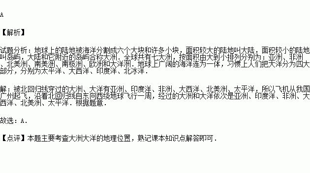 一架飞机从我国广州起飞,沿着北回归线自东向西绕地球飞行一周,请问这架飞机沿途依次经过哪些大洲和大洋?( )