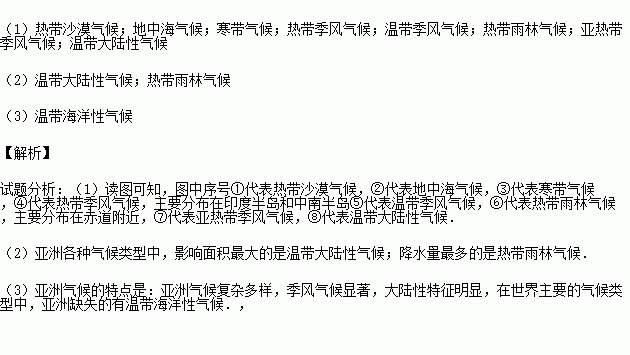 (3)在世界主要气候类型中,亚洲缺失的有____________气候。
