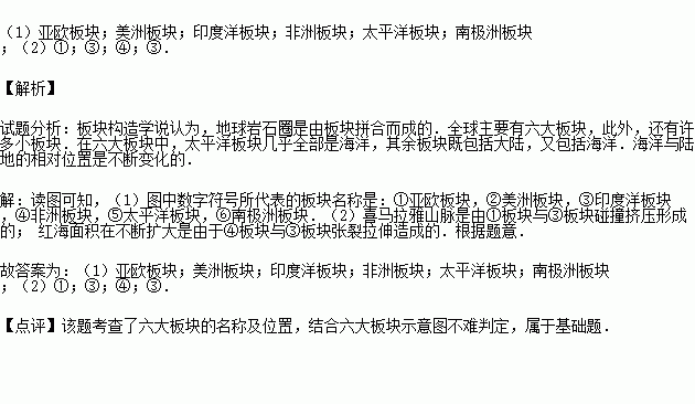 (2)喜马拉雅山脉是由 (填符号)板块与 (填符号)板块碰撞挤压形成的; 红海面积在不断扩大是由于 (填符号)板块与 (填符号)板块张裂拉伸造成的.