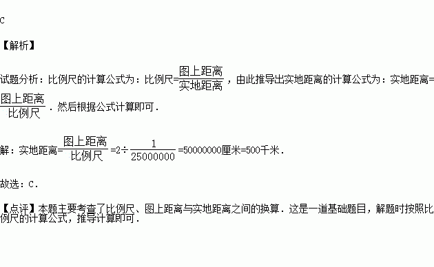 某地图比例尺为1:25000000,在图上量得两地间的距离是2厘米,则这两地之间的实地距离是( )