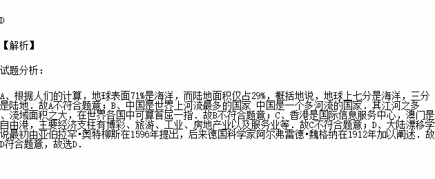 D.大陆漂移学说最初由亚伯拉罕·奥特柳斯在1596年提出