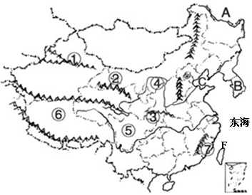 (1)依据位置,图中序号所代表的地理事物名称为:山脉①天山,②祁连山,③秦岭;河流④黄河,地形区⑤四川盆地;省区⑥西藏自治区;⑦福建省,行政中心是福州市.