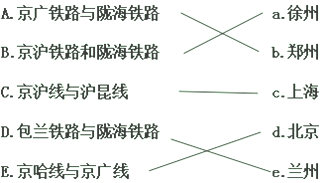 (3)我国铁路干线纵横交错、四通八达,在主要的铁路干线交汇处形成重要的交通枢纽.京广铁路和陇海铁路交汇于郑州,京沪铁路和陇海铁路交汇于徐州,京沪线与沪昆线交汇于上海,包兰铁路与陇海铁路交汇于兰州,京哈线与京广线交汇于北京.